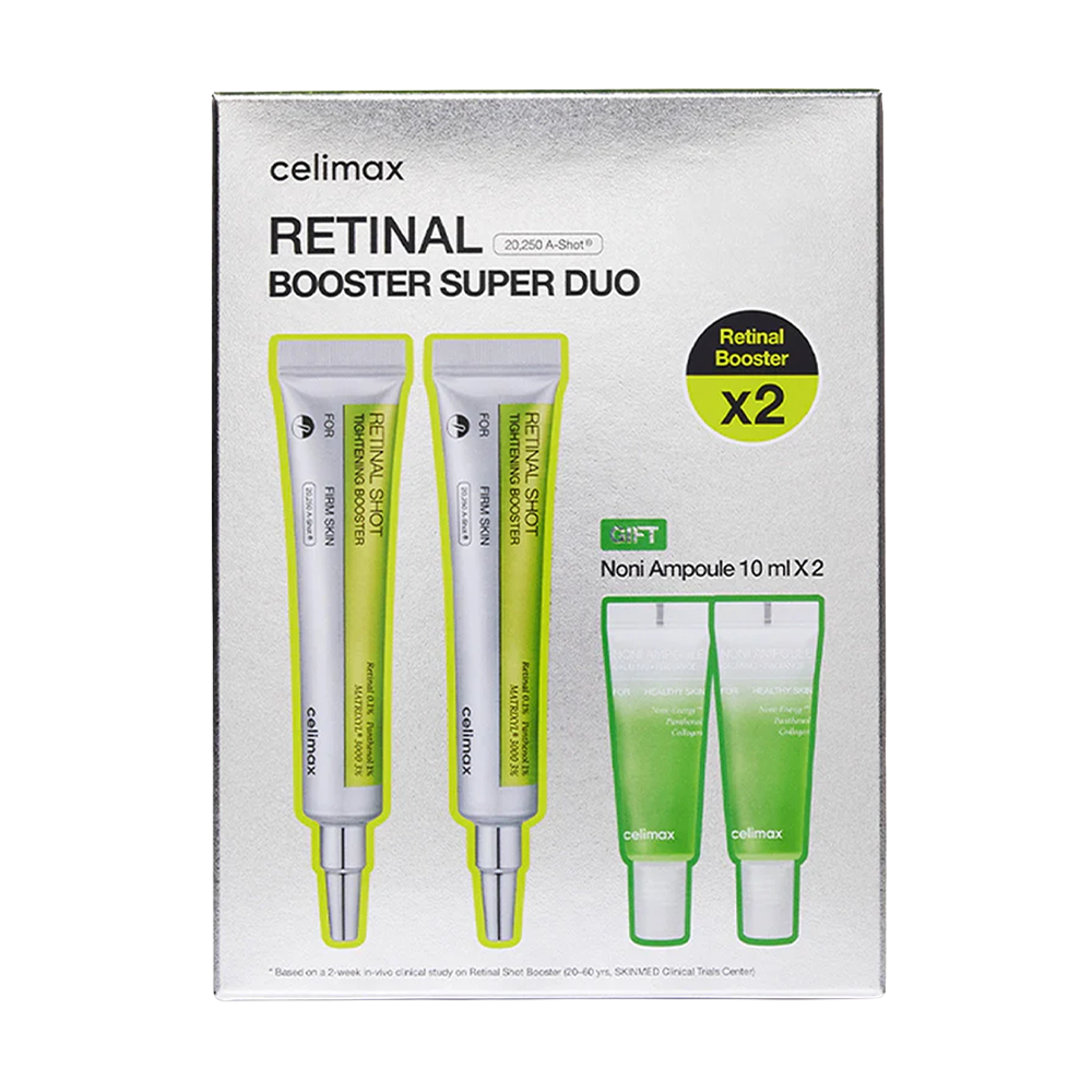 Das Celimax Retinal Booster Super Duo Set ist ein leistungsstarkes hauterneuerndes Treatment, das Anzeichen der Hautalterung, Festigkeitsverlust, ungleichmäßige Hautstruktur und vergrößerte Poren gezielt adressiert. Dank der A Shot™ Micro Particle Technologie von Celimax dringen die Wirkstoffe tief in die Haut ein, um die Elastizität zu verbessern und das Hautbild sichtbar zu glätten.