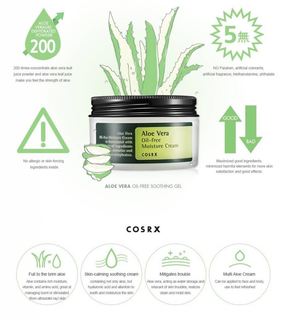 DieCOSRX Aloe Vera Oil Free Moisture Cream ist eine ölfreie, gelartige Feuchtigkeitscreme. Sie enthält 80 % Aloe Vera-Extrakte, spendet der Haut viel Feuchtigkeit und wirkt beruhigend und lindernd auf gereizte Haut.