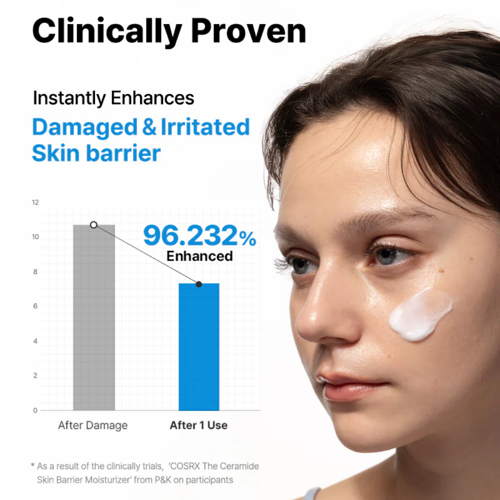 Die COSRX The Ceramide Skin Barrier Moisturizer ist eine reichhaltige, pflegende Creme, die die Hautbarriere stärkt und die Haut intensiv mit Feuchtigkeit versorgt. Ideal für trockene, empfindliche oder geschädigte Haut, beruhigt sie Rötungen und Irritationen und sorgt für langanhaltende Pflege. Die cremige Textur zieht schnell ein, ohne zu fetten – perfekt für die tägliche Anwendung morgens und abends.