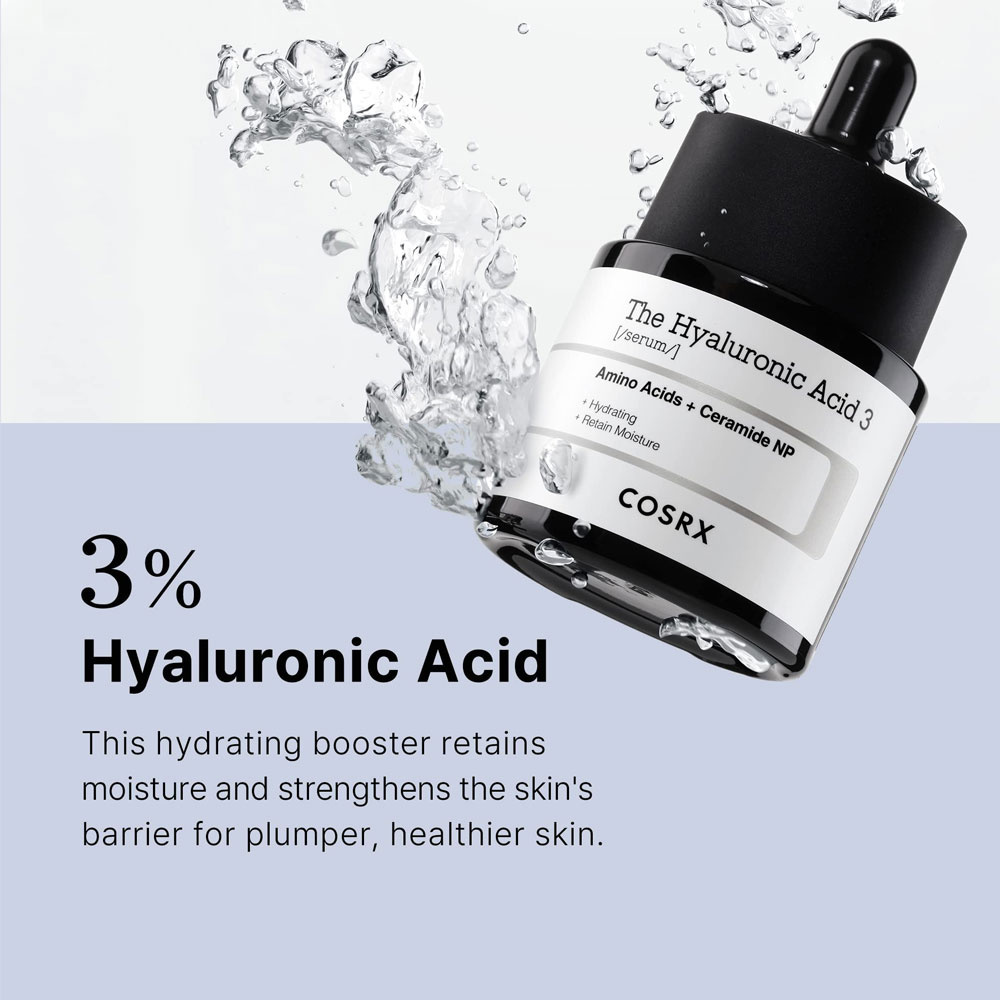 DasCosrx The Hyaluronic Acid 3 Serum enthält 3% niedermolekulare Hyaluronsäure für eine intensive Feuchtigkeitsversorgung, die tief in die Hautschichten eindringt. Die Formel ist außerdem mit Ceramiden und dem NMF-Aminosäurekomplex angereichert, um den optimalen Feuchtigkeitsgehalt zu erhalten und die Feuchtigkeitsbarriere der Haut zu schützen. Die leichte, flüssige Textur füllt trockene Haut sofort wieder auf und verleiht ihr ein strahlendes Aussehen.