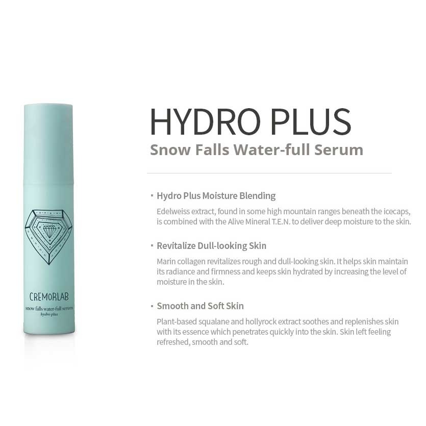 DerCremorlab Hydro Plus Snow Falls Velvet Toner enthält Edelweiß-Extrakt, der mit T.E.N.-Wasser gemischt ist, um die Haut intensiv mit Feuchtigkeit zu versorgen. Dieses Gesichtswasser hinterlässt ein sauberes, frisches Gefühl, ohne zu kleben, und dient der Haut als Booster für den nächsten Pflegeschritt.