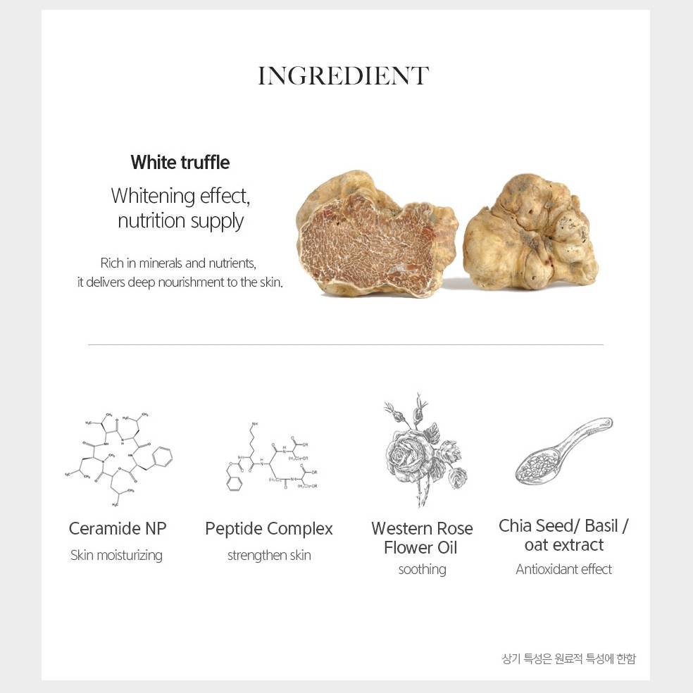 Wasser, Glycerin, Cetearylalkohol, Butylene Glycol, Tuber Magnatum Extract (2.9%), Caprylic/Capric Triglyceride, Olea Europaea (Olive) Fruit Oil, Niacinamide, 1,2-Hexanediol, Vitis Vinifera (Grape) Seed Oil, Pentaerythrityl Tetraisostearate, Persea Gratissima (Avocado) Öl, Butyrospermum Parkii (Shea) Butter, Dimethicone, Camellia Japonica Seed Oil, Cetearyl Olivate, Hydroxypropyl Methylcellulose, Polyglyceryl-3 Methylglucose Distearate, Stearic Acid, Sorbitan Olivate, Prunus Amygdalus Dulcis (Sweet Almond) Oil, Glyceryl Stearate, Carbomer, Arginin, Pullulan, Xanthan Gum, Mauritia Flexuosa Fruit Oil, Helianthus Annuus (Sunflower) Seed Oil, Octyldodecanol, Rosa Centifolia Flower Oil, Tocopheryl Acetate, Salvia Hispanica Seed Extract, Ethylhexylglycerin, Ocimum Basilicum (Basilikum) Flower/Leaf/Stem Extract, Avena Sativa (Hafer) Kernel Extract, Dipotassium Glycyrrhizate, Adenosine, Ribes Nigrum (Schwarze Johannisbeere) Seed Oil, Disodium EDTA, Porphyridium Cruentum Extract, Alkanna Tinctoria Root Extract, Hyaluronsäure, Helianthus Annuus (Sunflower) Seed Oil Unsaponifiables, Acetyl Glutamine, Lecithin, Polysorbate 20, Cardiospermum Halicacabum Flower/Leaf/Vine Extract, Tocopherol, Hexapeptide-11, Hydrogenated Lecithin, Folic Acid, Caprylyl Glycol, Oligopeptide-3, Oligopeptide-2, Oligopeptide-1, Natriumhyaluronat, Bacillus/Sojabohnen-Fermentextrakt, Rosmarinus Officinalis (Rosmarin) Blattextrakt, Ceramide NP(Ceramide 3), Palmitoyl Tripeptide-1, Palmitoyl Tetrapeptide-7