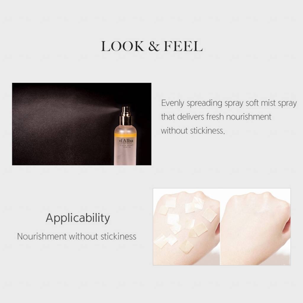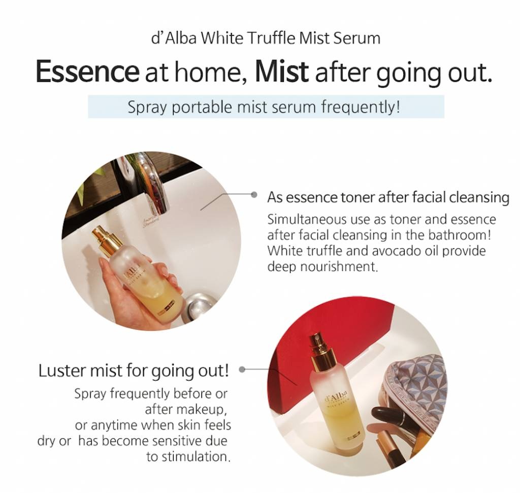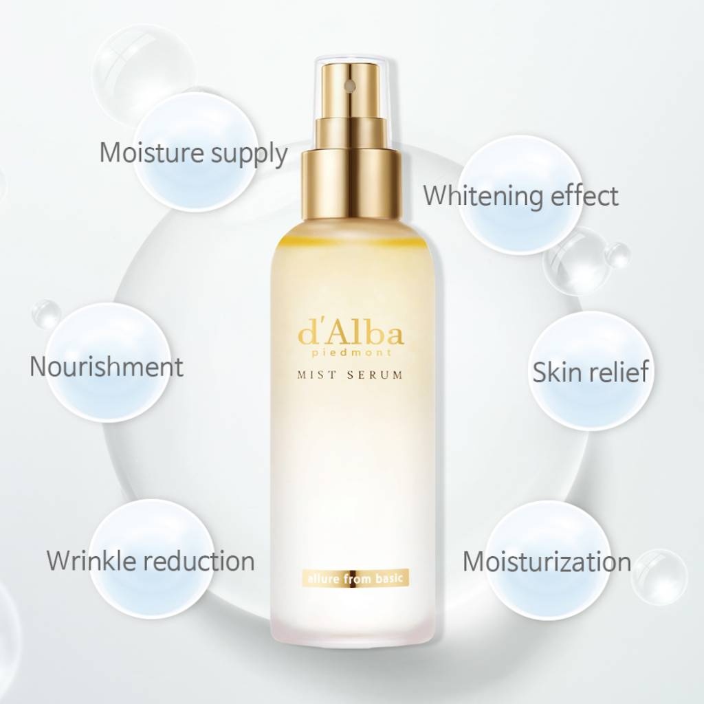 Dasd'Alba White truffle Mist Serum strafft und befeuchtet die Haut gleichzeitig. Mit natürlichen Star-Inhaltsstoffen wie Pflanzen-, Sonnenblumenkern- und Avocado-Öl liefert das Serum eine leistungsstarke Feuchtigkeitsversorgung und schützt die Haut vor chronischem Feuchtigkeitsverlust. Es enthält Bifida-Ferment-Lysat, Chiasamen-Extrakt, Adenosin und Niacinamid, um deine Haut mit Antioxidantien aufzuladen sowie den Hautton aufzuhellen und Falten zu pflegen. Ein tolles praktisches Produkt mit einem angenehmen Duft, um auch unterwegs schön zu bleiben!