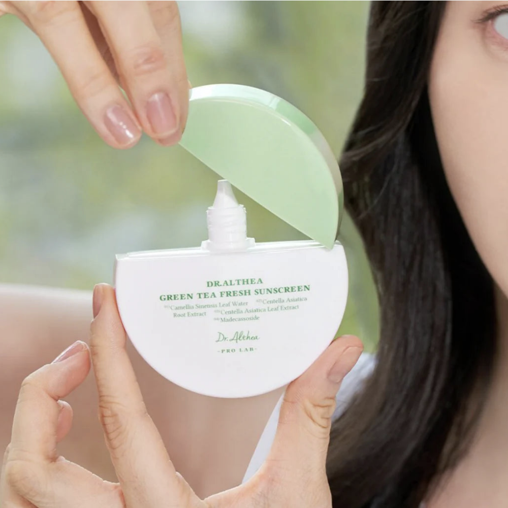 Dr. Althea Green Tea Fresh Sunscreen SPF50+ PA++++ ist ein Muss für alle, die einen atmungsaktiven, nicht-komedogenen Sonnenschutz suchen, der gleichzeitig pflegt. Sie spendet Feuchtigkeit, beruhigt und schützt, während sie ein frisches, mattes Finish hinterlässt — perfekt für den täglichen Gebrauch, auch bei empfindlicher oder zu Akne neigender Haut.