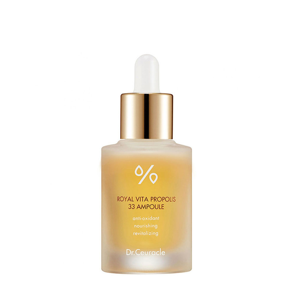 Eine konzentrierte Mischung aus Propolis-, Centella Asiatica-, Sanddorn-, Hamamelis- und Rosenextrakten sowie 3 Arten von Vitaminen. Die Dr.Ceuracle Royal Vita Propolis 33 Ampulle erhöht den Feuchtigkeits- und Nährstoffgehalt der Haut, steigert die Vitalität und schützt und strafft die Haut. Für beste Ergebnisse kombiniere sie mit der Dr. Ceuracle Vita Propolis Creme.