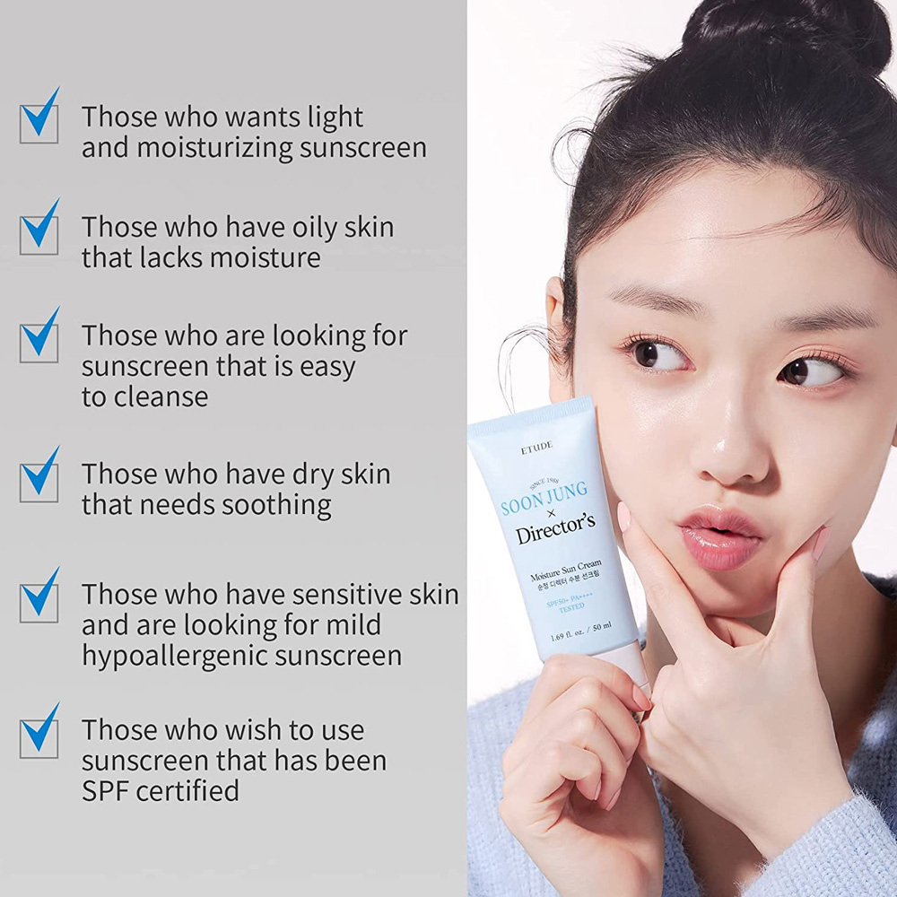 Die Etude House Soonjung Director's Moisture Sun Cream ist eine vegane, hypoallergene Sonnenschutzcreme mit einer leichten Textur. Die Creme enthält Panthenol, Centella Asiativa und Allantoin, um die Haut mit Feuchtigkeit zu versorgen und weich zu machen. Sie ist frei von 9 schädlichen Inhaltsstoffen, EVE-geprüft, für empfindliche Haut geeignet und hinterlässt keinen fettigen Film.