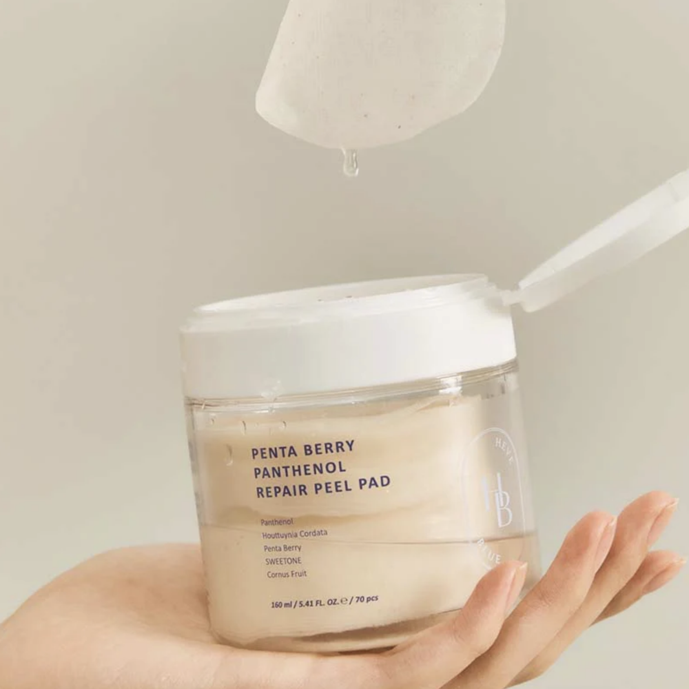 Das HEVEBLUE Penta Berry Panthenol Repair Peel Pad ist ein sanftes, exfolierendes Tonerpad, das speziell für empfindliche Haut entwickelt wurde. Angereichert mit fünf antioxidansreichen Beeren, Panthenol und Houttuynia Extract entfernt es Unreinheiten, gleicht den Hautton aus und stärkt die Hautbarriere, ohne zu reizen. SWEETONE® sorgt zusätzlich für mehr Leuchtkraft und eine verfeinerte Hautstruktur, sodass die Haut glatt, frisch und natürlich strahlend bleibt.