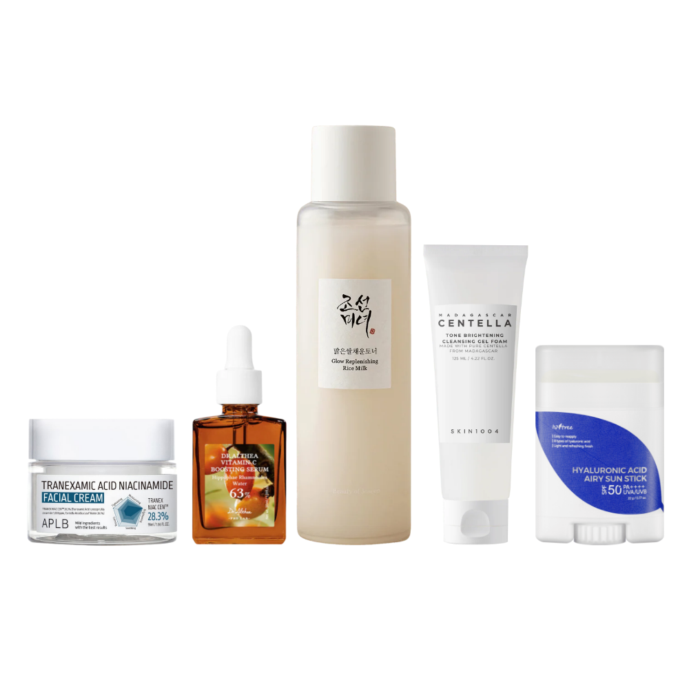 Verschönere und gleiche deinen Hautton aus mit der Hyperpigmentierung-Set – einer Fünf-Schritte-Routine, die dunkle Flecken reduziert, Glow verstärkt und die Hautbarriere stärkt. Diese kuratierte Auswahl kombiniert milde Aufheller wie Reisextrakt, Vitamin C, Glutathion und Niacinamid. Gesamtwert: €86,23, jetzt für €64,99.