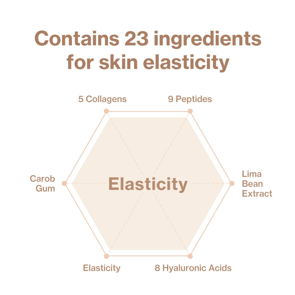 Water, Glycerin, Sodium Polyacrylate, Niacinamide, Ceratonia Siliqua (Carob) Gum, Chondrus Crispus Powder, Cetyl Ethylhexanoate, Hydroxyacetophenone, Xanthan Gum, Carrageenan, Phenoxyethanol, Aluminum Glycinate, Glucomannan, Potassium Chloride, Tetrasodium Pyrophosphate, Dextrin, Polysorbate 80, Adenosine, Ethylhexylglycerin, Tartaric Acid, Silica, Fragrance, Butylene Glycol, Collagen, Hydrolyzed Sponge, 1,2-Hexanediol, Alcohol, Tocopherol, Sodium Deoxycholate, Tyrosine, Ginkgo Biloba Leaf Extract, Polygonum Fagopyrum Seed Extract, Nelumbo Nucifera Leaf Extract, Sodium Hyaluronate, Soluble Collagen, Curcuma Longa Root Extract, Prunella Vulgaris Extract, Dioscorea Japonica Root Extract, Morus Alba Root Extract, Cetyl Hydroxyethylcellulose, Disodium Phosphate, Potassium Phosphate, Succinoyl Atelocollagen, Rutin, Acetyl Tetrapeptide-5, Dextran, Hydrolyzed Collagen, Hydrolyzed Elastin, Hydroxypropyltrimonium Hyaluronate, Tripeptide-1, Palmitoyl Tetrapeptide-7, Palmitoyl Tripeptide-1, Hexapeptide-9, Hydrolyzed Hyaluronic Acid, Nonapeptide-1, Sodium Acetylated Hyaluronate, Palmitoyl Pentapeptide-4, Phaseolus Lunatus Seed Extract, Hyaluronic Acid, Collagen Extract, Copper Tripeptide-1, Hydrolyzed Sodium Hyaluronate, Sodium Hyaluronate Crosspolymer, Acetyl Hexapeptide-8, Potassium Hyaluronate.