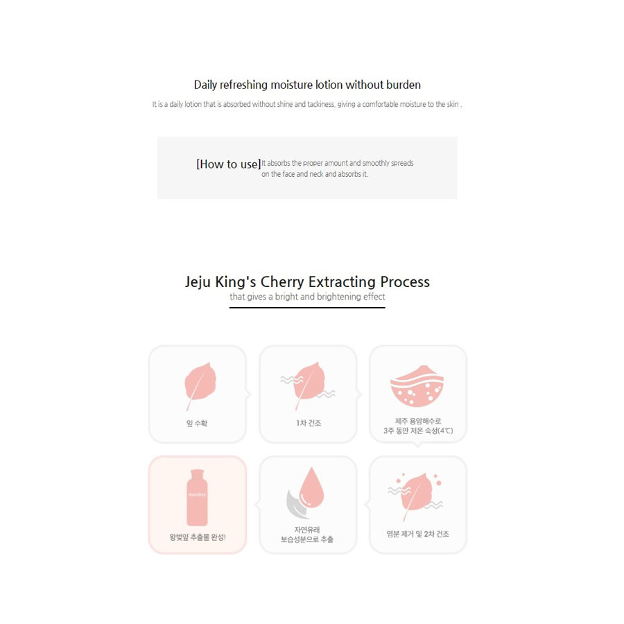 Innisfree Jeju Cherry Blossom Lotion ist eine hautauffüllende, aufhellende Lotion mit Jesu Kirschblüte, die einen strahlenden Hautton erzeugt. Mit der feuchtigkeitsspendenden Kraft von Betain, das aus der Zuckerrübe gewonnen wird und eine feuchtigkeitsspendende Schutzbarriere bildet. Die Haut wird durch diese Lotion, die eine weiche, angenehme Textur hat, die sich glatt und taufrisch anfühlt, tiefgehend hydratisiert und wiederhergestellt.