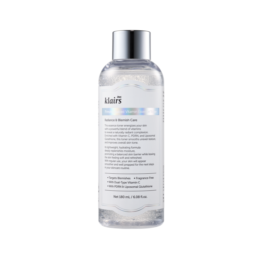 Die Dear Klairs Freshly Juiced Vitamin Essence Toner ist ein aufhellender und feuchtigkeitsspendender Toner, der die Haut revitalisiert und Hyperpigmentierung reduziert. Mit verkapseltem Vitamin C, liposomalem Glutathion und Rice PDRN verbessert sie den Hautton und sorgt für ein gesundes Strahlen. Fünf Arten von Hyaluronsäure und Ceramide NP stärken die Hautbarriere, während PHA sanft abgestorbene Hautzellen entfernt.