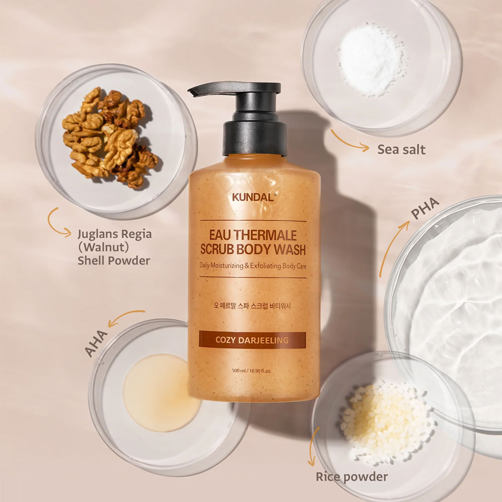 Erlebe koreanische Hautpflege in deiner täglichen Dusche mit dem Kundal Eau Thermale Spa Scrub Body Wash Violet Muguet, einem luxuriösen Duschgel, das sanftes Peeling mit intensiver Feuchtigkeitspflege vereint – für eine glatte, frische und strahlende Haut.