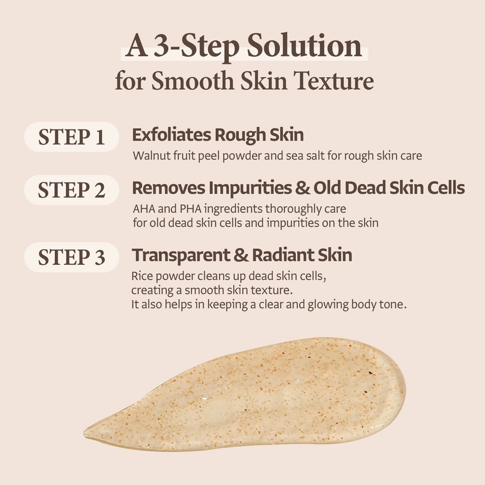 Mit Reispuder und Walnussschalenpulver entfernt es abgestorbene Hautzellen sanft, während Meersalz entgiftet und die Haut belebt. Lavendelöl und Panthenol beruhigen die Haut und wirken antiseptisch. Die Kombination aus fünf Ceramiden, Cholesterin und Gluconolacton stärkt die Hautbarriere und speichert Feuchtigkeit. Der zarte, blumige Duft von Violet Muguet rundet dieses Pflegeerlebnis auf elegante Weise ab.