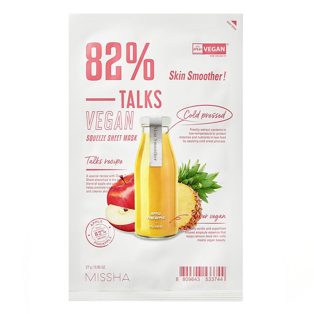 Missha Talks Vegan Squeeze Sheet Mask Skin Smoother ist eine Blattmaske, die mit einer Superfood-Saftmischung aus Apfel (Malus Domestica Fruit Extract) und Ananas (Pineapple Fruit Extract) getränkt ist, die abgestorbene Hautzellen entfernt und die Haut weich macht.