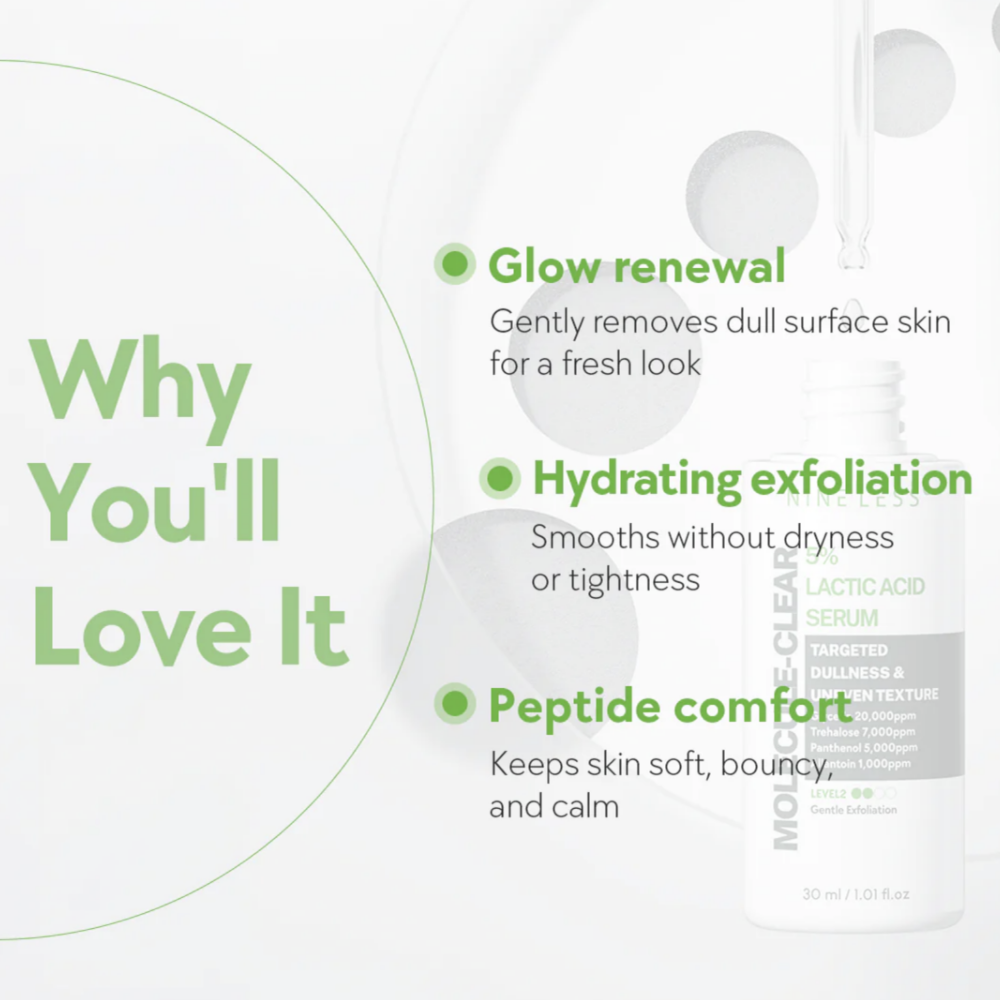 Das Nine Less Molecule-Clear 5 % Milchsäure-Serum macht deine Haut glatt und fein, damit sie frisch und strahlend aussieht. Dieses sanfte Serum peelt ohne zu reizen und entfernt abgestorbene Hautzellen, sodass dein Teint weicher und gleichmäßiger wird. Es verbessert die Hautstruktur, macht sie straffer und lässt sie wieder gesund leuchten. Perfekt für matte, unebene oder zu Unreinheiten neigende Haut, die eine milde, aber wirksame Pflege braucht.