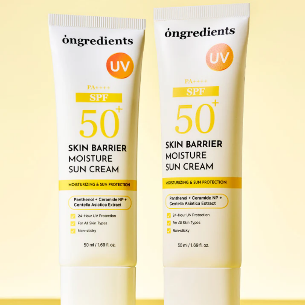 Die Ongredients Skin Barrier Moisture Sun Cream PA++++ SPF50+ ist eine feuchtigkeitsspendende Sonnencreme mit Niacinamide und Ceramide NP, die die Haut vor UV-Strahlen schützt, die Hautbarriere stärkt und für langanhaltende Hydration sorgt.