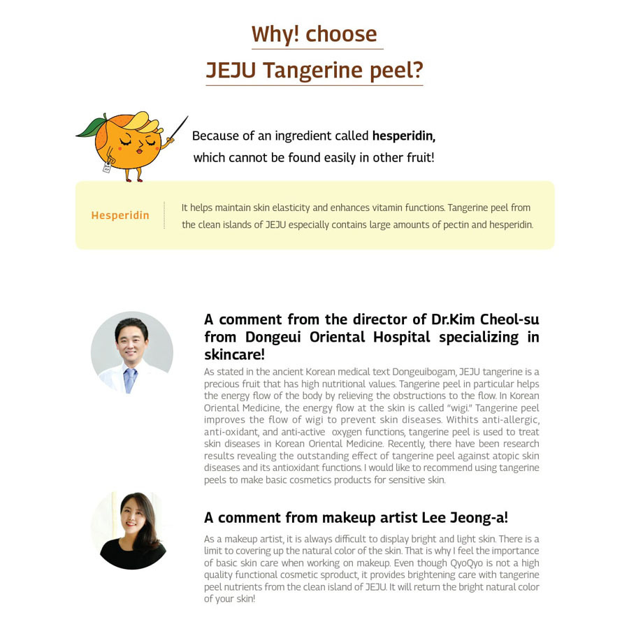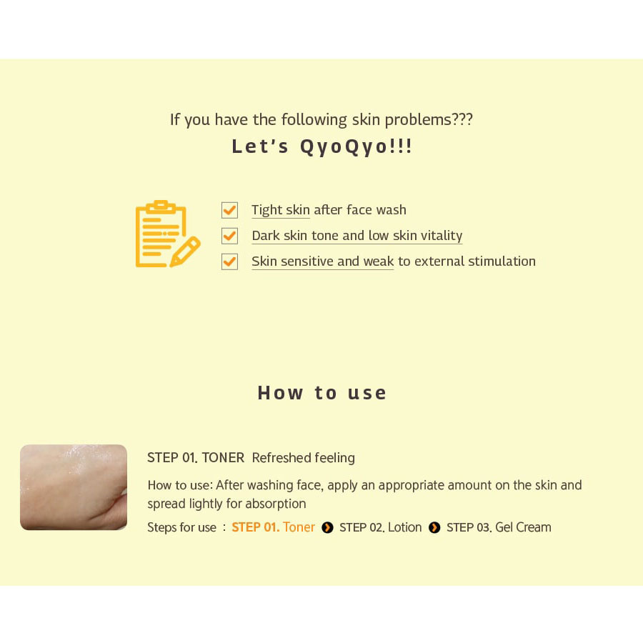Qyo Qyo Tangerine Bright+Moist Toner ist ein feuchtigkeitsspendender Toner, der die Haut beruhigt und mit Feuchtigkeit versorgt und gleichzeitig den pH-Wert der Haut ausgleicht. Es enthält Inhaltsstoffe, die die Haut aufhellen, wie z. B. Mandarinenpeeling, und Hyaluronsäure, die die Haut tiefgehend mit Feuchtigkeit versorgt. Die sieben Blumenextrakte in diesem Gesichtswasser nähren die Haut und sorgen für eine stärkere Feuchtigkeitsbarriere. Verwende dieses Gesichtswasser, um eine geschmeidige, strahlende Haut zu bekommen.