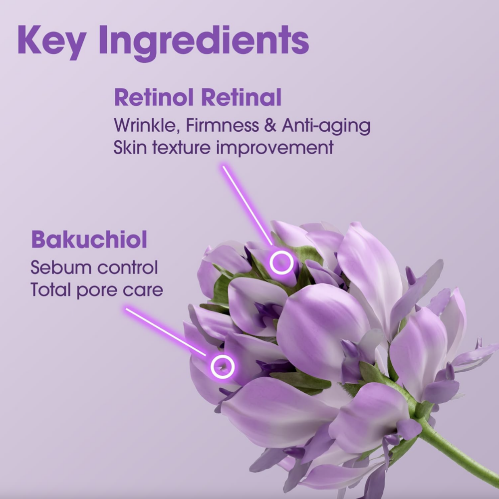 Retinol Intense Reactivating Serum: Water, Cyclohexasiloxane, Dicaprylyl Carbonate, Glycerin, Methylpropanediol, 1,2-Hexanediol, Niacinamide, Hydrogenated Poly(C6-14 Olefin), Panthenol, Tocopheryl Acetate, Piper Methysticum Leaf/Root/Stem Extract, Centella Asiatica Extract, Panax Ginseng Berry Extract, Glycyrrhiza Glabra Root Extract, Ficus Carica Fruit Extract, Melaleuca Alternifolia Leaf Extract, Artemisia Capillaris Extract, Bakuchiol, Retinol, Retinal, Ceramide NP, Beta-Glucan, Bifida Ferment Lysate, Collagen, Tocopherol, Resveratrol, Moringa Oleifera Seed Oil, Madecassoside, Asiaticoside, Asiatic Acid, Madecassic Acid, Fragrance, Ethylhexylglycerin