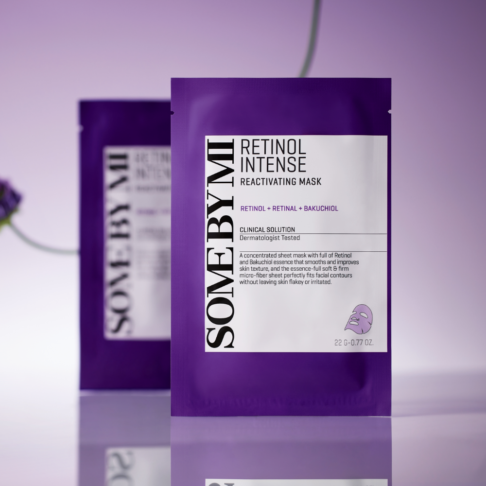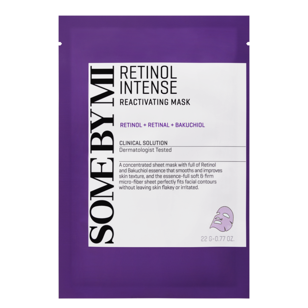 Die Some By Mi Retinol Intense Reactivating Mask ist eine Blattmaske mit Retinol, Retinal und Bakuchiol, die die Zeichen der Hautalterung bekämpft, indem sie die Elastizität der Haut verbessert, ohne sie zu reizen. Sie enthält außerdem 10 Arten von Hyaluronsäure, die die Feuchtigkeitsbarriere der Haut hydratisiert und stärkt. Das Mikrofasertuch passt sich perfekt an das Gesicht an und hilft, die Wirkstoffe tief in die Haut einzuschleusen. Geeignet für empfindliche Haut.