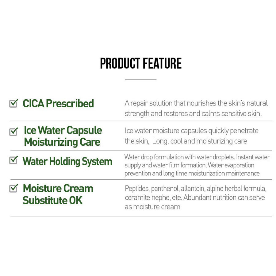 Wasser, Butylene Glycol, Glycerin, Cyclopentasiloxane, Cyclohexasiloxane, Cetyl PEG/PPG-10/1 Dimethicone, Cyclomethicone, Phenoxyethanol, Chlorphenesin, Dimethicone/Vinyl Dimethicone Crosspolymer, Fragrance, Disodium EDTA, Ceramide NP, Allantoin, Panthenol, Glacier Water, Aloe Barbadensis Leaf Juice, Centella Asiatica Extract, Alcohol, 1,2-Hexanediol, Gentiana Lutea Root Extract, Achillea Millefolium Extract, Artemisia Absinthium Extract, Arnica Montana Flower Extract, Propylene Glycol, Caprylyl Glycol, Potassium Sorbate, Ethylhexylglycerin, Acetyl Hexapeptide-8, Copper Tripeptide-1, Palmitoyl Pentapeptide-4