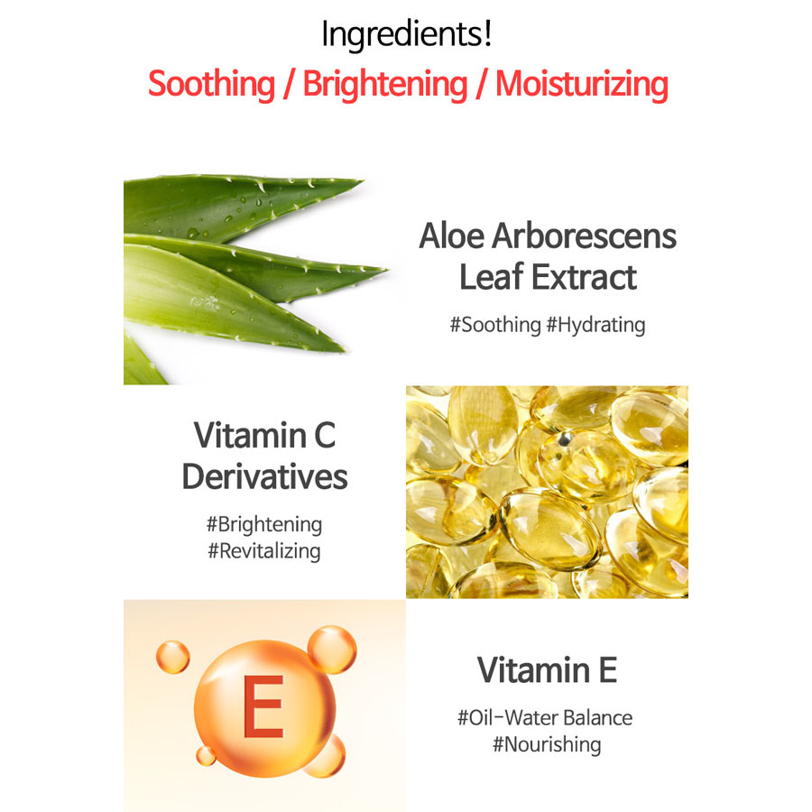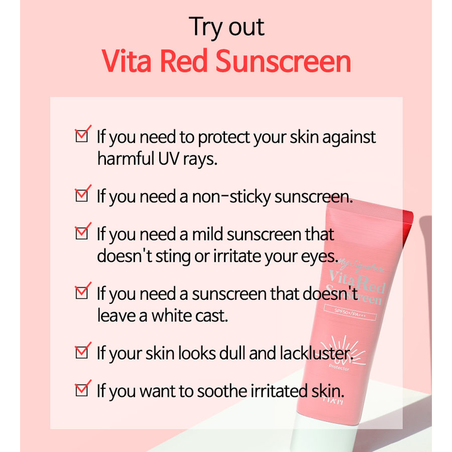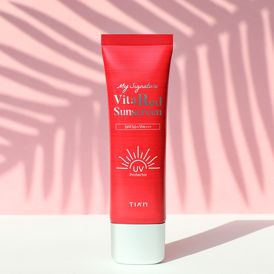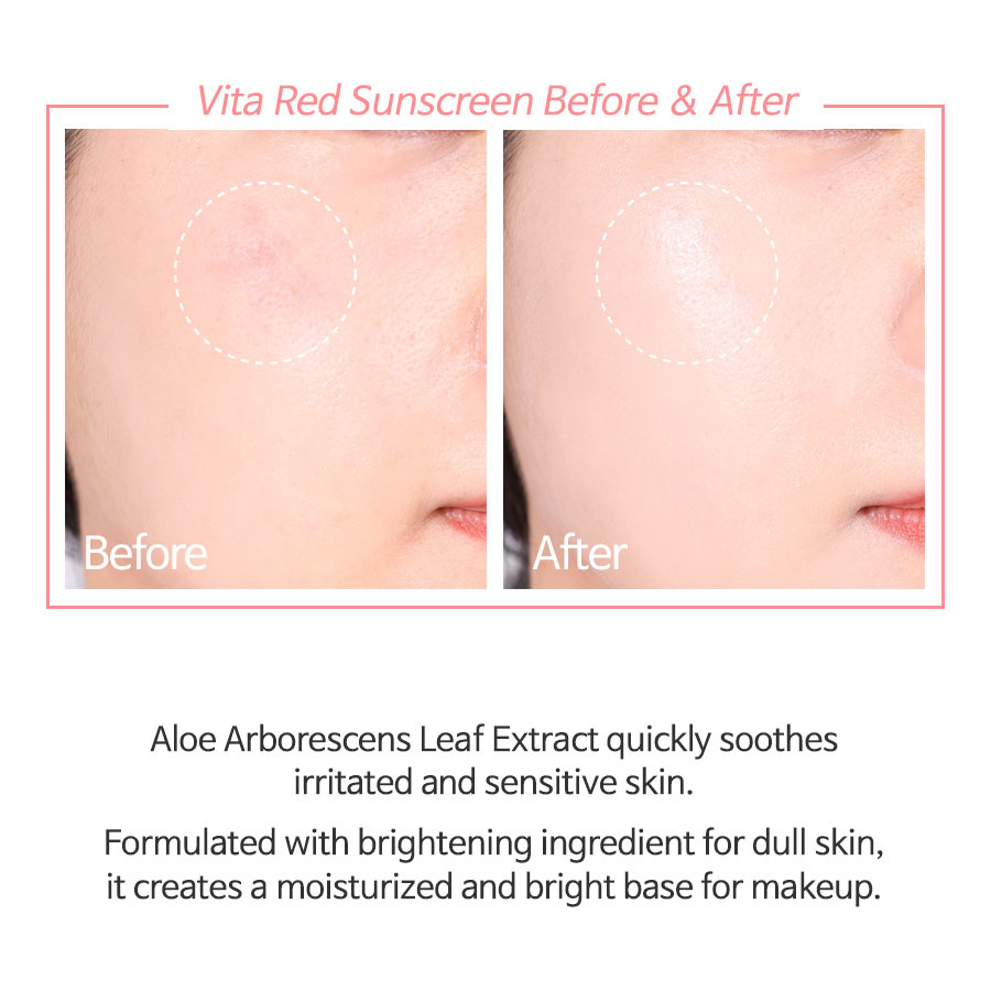TIA'M My Signature Vita Red Sunscreen SPF50+ PA+++ ist mit Aloe-Blatt-Extrakt formuliert, um die Haut tagsüber zu beruhigen und zu schützen. Außerdem enthält sie Vitamin C, das Aknenarben und Verfärbungen aufhellt und die Wirksamkeit der UV-Filter verstärkt. Sie ist für die ganze Familie geeignet und kann das ganze Jahr über verwendet werden.