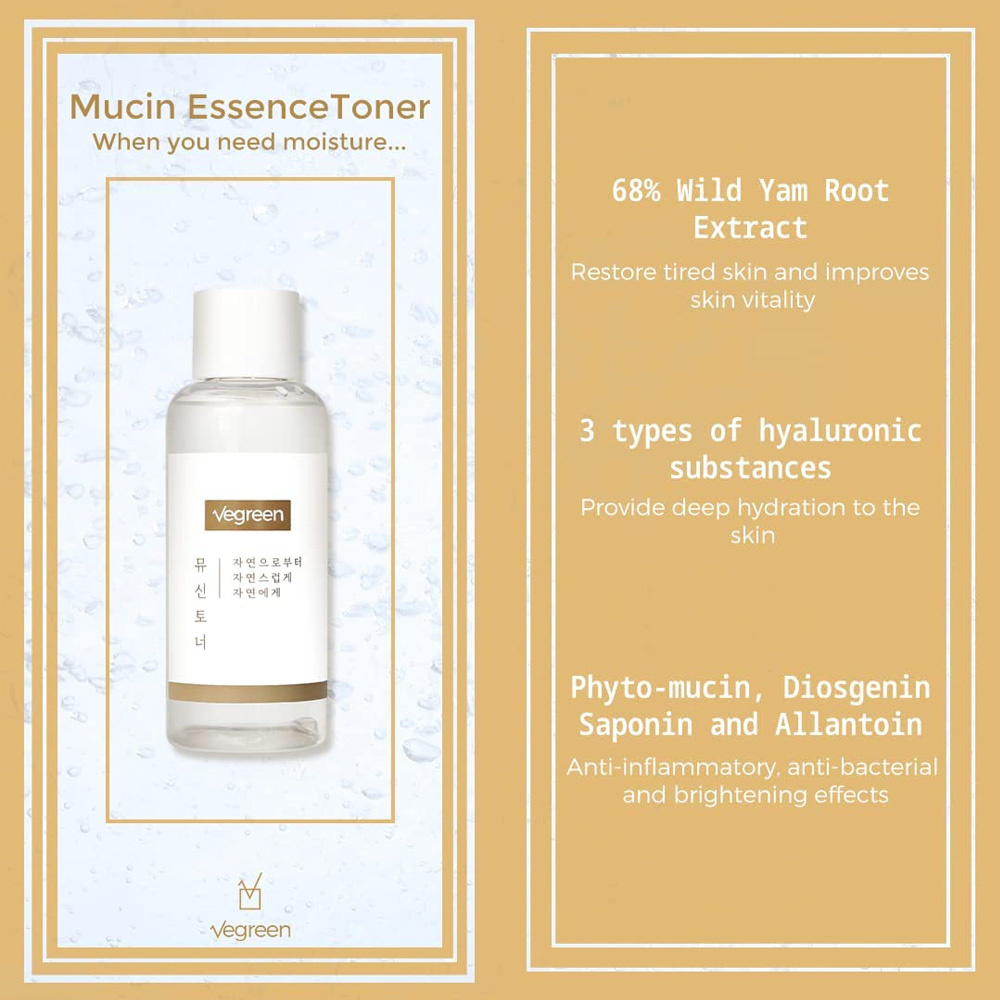 Vegreen Alcohol-Free Nature Mucin Toner enthält 68% Mucin aus wildem Yamsextrakt, das müde Haut wieder aufbaut und die Hautvitalität verbessert.
