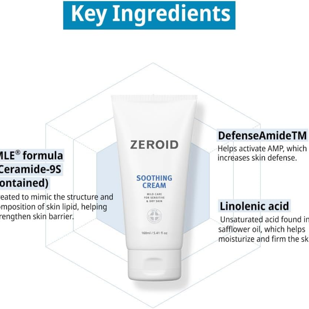 Zeroid Soothing Cream ist eine sanfte, pflegende Creme für empfindliche und trockene Haut, die schnell gereizt reagiert. Die angenehme Textur beruhigt die Haut sofort, hilft Rötungen zu reduzieren und stellt das Hautgefühl wieder her. Sie zieht schnell ein, fettet nicht und ist für die ganze Familie geeignet.